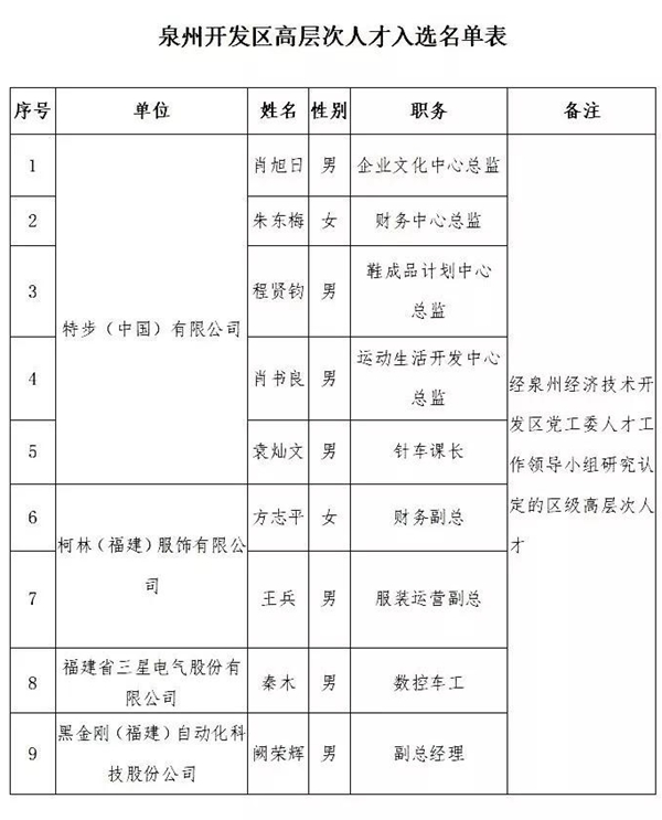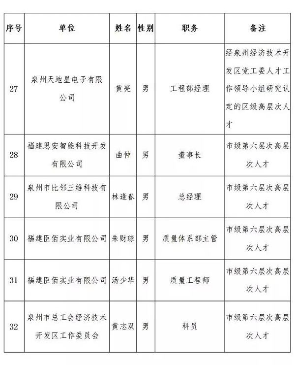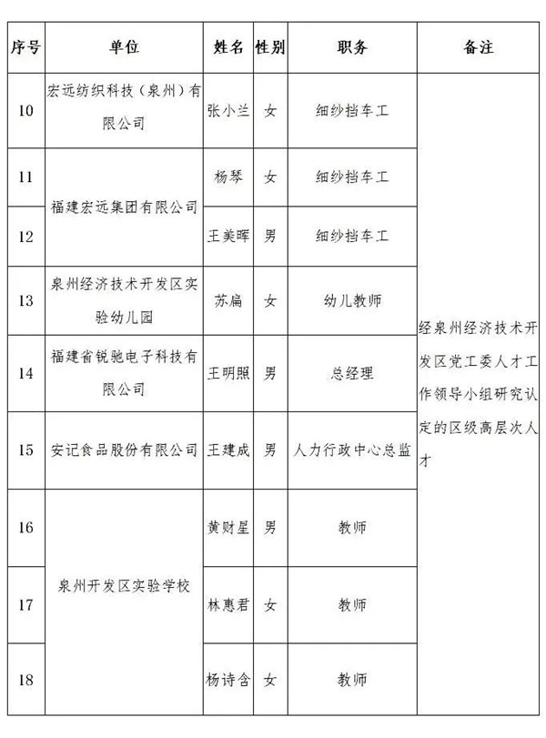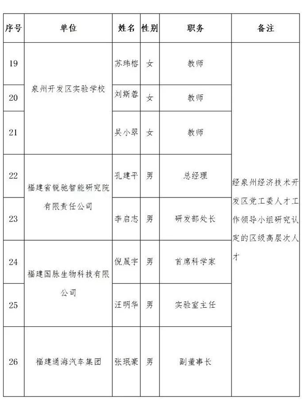 根据《中共泉州市人才工作领导小组关于印发泉州市高层次人才认定规定的通知》(泉委人才[2018]19号)和《泉州开发区高层次人才享受工作生活待遇暂行规定》(泉开委〔2017〕59号)文件规定,为广泛接受社会监督,现将泉州市第六层次高层次人才和泉州开发区第二批区级高层次人才认定核准名单予以公示。任何单位和个人对公示名单有异议的,均可在公示期内以来电、来信(邮)、来访的方式提出。 公示时间:3月25日至3月29日 联系电话:0595-22353029(泉州开发区人才科) 电子邮箱:qmbsh@163.com 来信来访地址:泉州经济技术开发区管委会办公大楼二楼222 泉州经济技术开发区 党工委人才工作领导小组 2019年3月22日