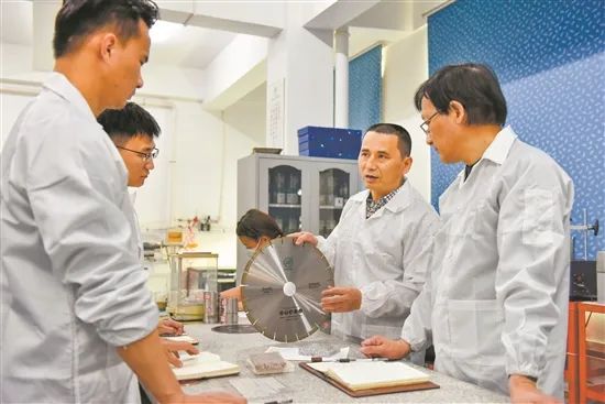 泉州市高层次人才郭镇义(右二)带领科研团队讨论研究金刚石锯片(泉州开发区党工委人才办供图)