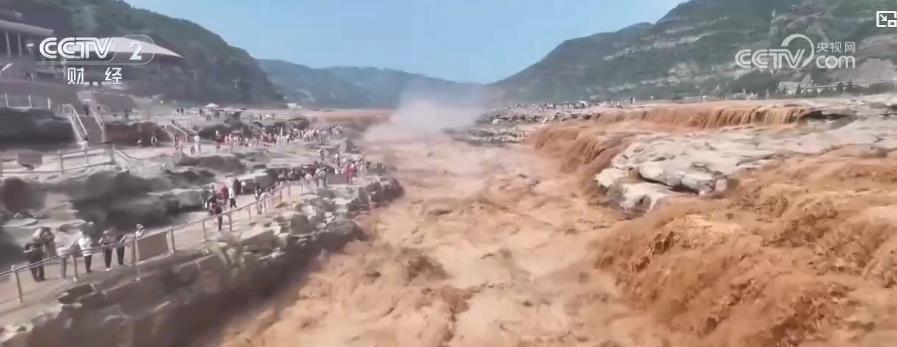 通过航拍镜头可以看到,滔滔黄河水以排山倒海之势从壶口处奔腾而下,激起千层浪花。此时,汹涌澎湃的水流撞击河槽底部之后,发出震耳欲聋的轰鸣声,在峡谷间回荡。众多游客也纷至沓来,只为一睹这震撼的美景。据了解,每年9月中旬到10月底,黄河壶口段的水流量一般将维持在每秒1500立方米左右,并形成壮美瀑布群景观,这也意味着黄河壶口瀑布景区迎来最佳观赏期。