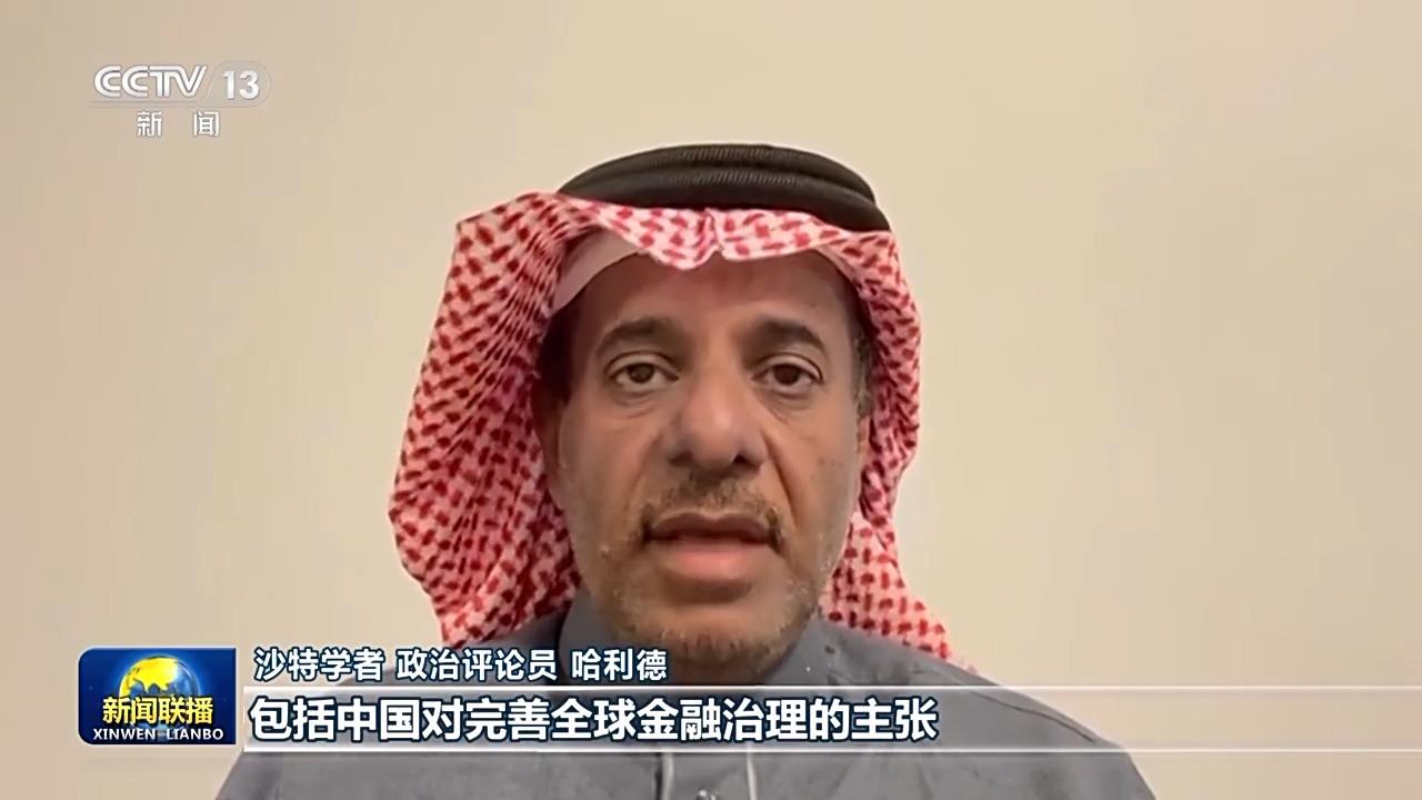 沙特学者、政治评论员 哈利德:中国国家主席的讲话阐述了中国的理念,包括中国对完善全球金融治理的主张。当今发达国家和发展中国家发展差异显著,而现行的国际制度和体系加深了这种差异,应推进世界银行、国际货币基金组织等机构改革,增加发展中国家话语权。