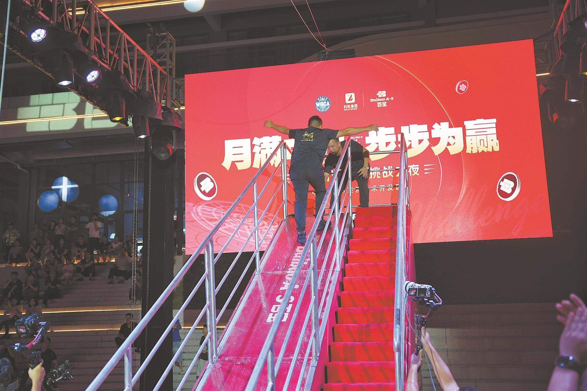 本报讯 (融媒体记者游怡冰 通讯员肖林彬 文/图)7日,在泉州开发区“月满中秋 步步为赢”世界防滑纪录挑战之夜活动中,开发区企业研发的止滑鞋成功通过世界纪录认证机构(WRCA)现场测试,在26度油水混合玻璃斜坡上实现稳定行走,刷新该领域世界纪录。