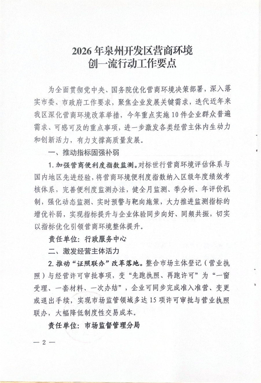 为深入贯彻落实党中央、国务院及市委、市政府优化营商环境工作部署,聚焦企业群众急难愁盼,近日,泉州开发区印发《2026年泉州开发区营商环境创一流行动工作要点》,围绕指标固强补弱、经营主体活力、便捷政务服务、科技创新服务、企业融资便利、劳动就业用工、文化卫生发展、涉企执法规范、园区治理效能、接诉即办机制十大方向,推出20项可感可及、务实管用举措,全力打造一流营商环境,以高质量服务赋能开发区高质量发展。